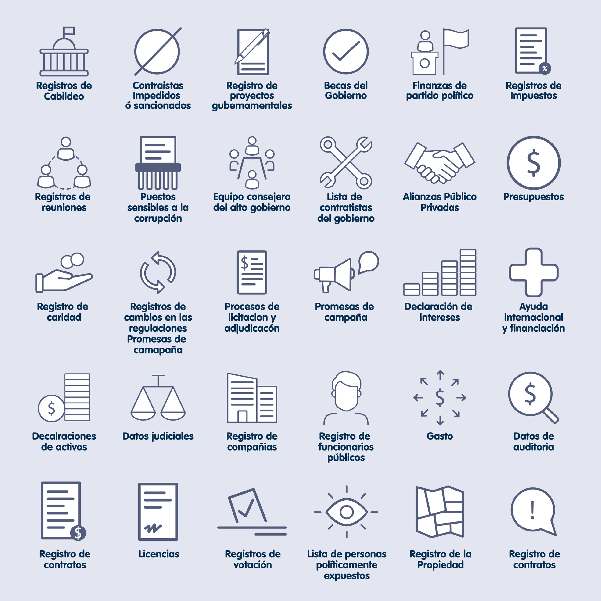 Los conjuntos de datos del PIDA están basados en la “Guía de Apertura: Usar Datos Abiertos para Combatir la Corrupción” del Open Data Charter, el cual contiene 30 conjunto de datos que son considerados prioritarios para la construcción de una infraestructura de datos contra la corrupción.